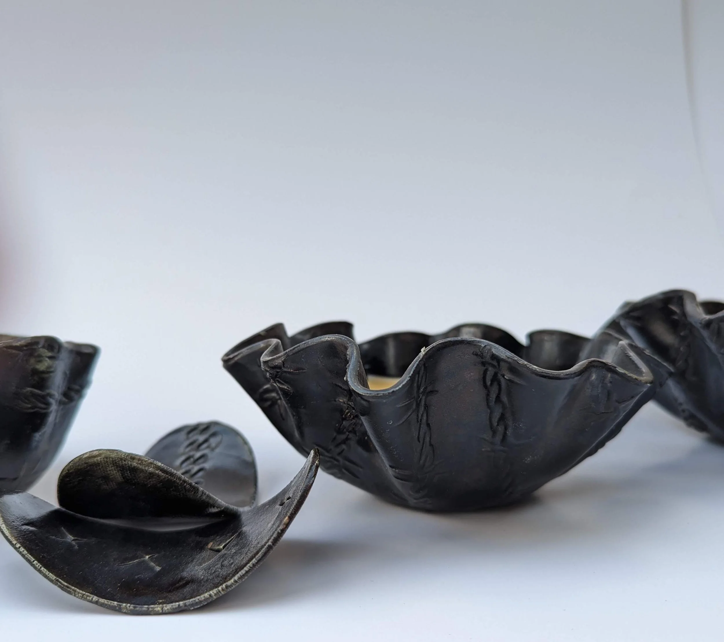 Exalt yourself with this beeswax candle.poured into a barbwire or scale-embossed holder with a tray for ashing and incense. Exalted line Dishwasher, microwave-safe. Serve chilled or warmed. Available in matte black or jade green order on instagram@jenesis_ceramics